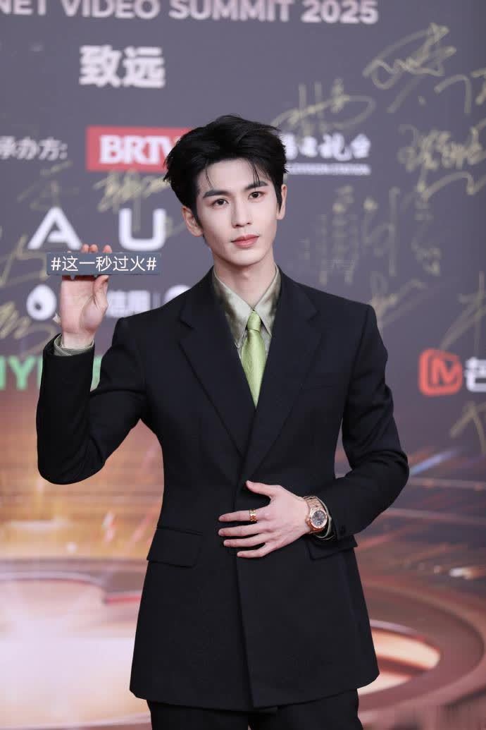 张凌赫以电视剧《爱你》中何苏叶医生的形象现身红毯,黑色西装搭配墨绿色衬衫,尽显贵气,可谓360度无死角的帅气。