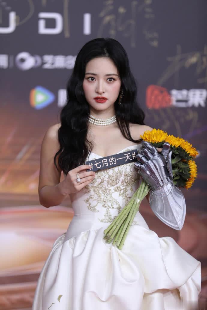 沈月也大胆突破以往的“甜妹”形象,从公主摇身一变成为骑士。一袭白色礼服搭配金色刺绣,尽显华丽大气,珍珠项链的点缀让她看起来优雅成熟。然而,手中的向日葵略显随意,在一定程度上破坏了造型的质感与美感。